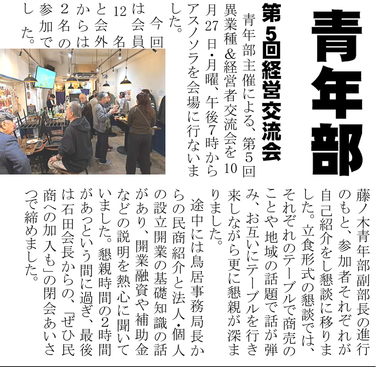 今回は会員12名と会外からは2名の参加でした。藤ノ木青年部副部長の進行のもと、参加者それぞれが自己紹介をし懇談に移りました。立食形式の懇談では、それぞれのテーブルで商売のことや地域の話題で話が弾み、お互いにテーブルを行き来しながら更に懇談が深まりました。