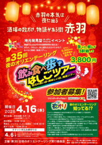 夜オリ 「第35回夜オリ」参加店紹介 「第35回夜のオリエンテーリング」赤羽地域参加店紹介ページです。 当日はこのお店の中から主催者の指定した3店を回っていただきます。 どの店舗を回るかは当日をお楽しみに♪ 追加店舗随時更新します。 店舗詳細は店舗画面をクリックして... 2026.03.03 夜オリ