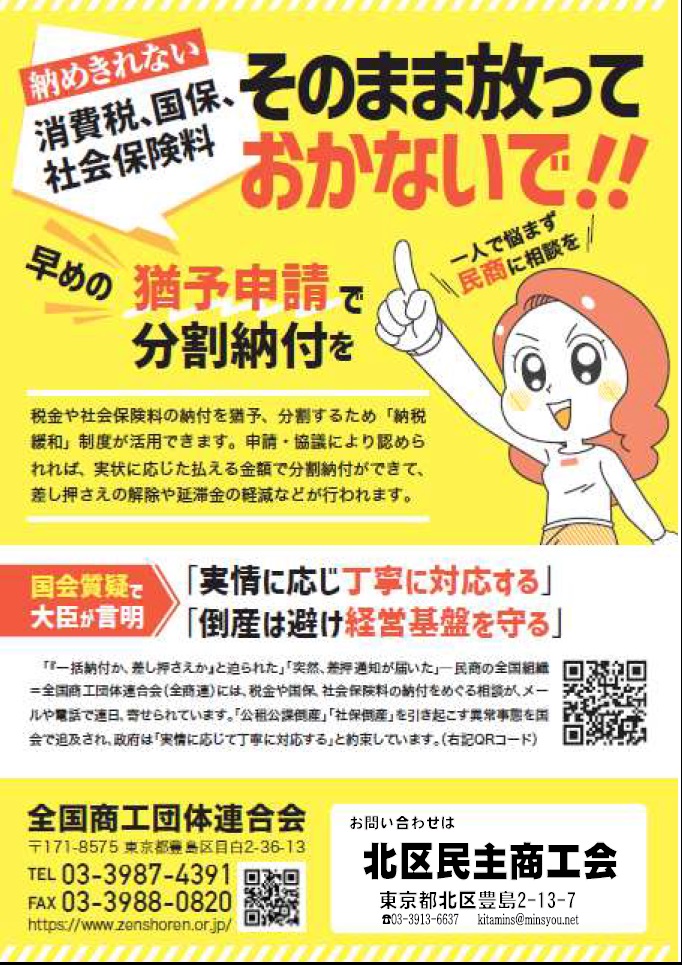 税金(国税、住民税)・社会保険料・国保の支払に困ってる方へ「税金を払いたくても払えない」「売掛金を差し押さえられた」など、厳しい経営実態の下で、税金や社会保険料、国保などが払いきれず、やむなく滞納してしまう納税者が急増しています。払えない税